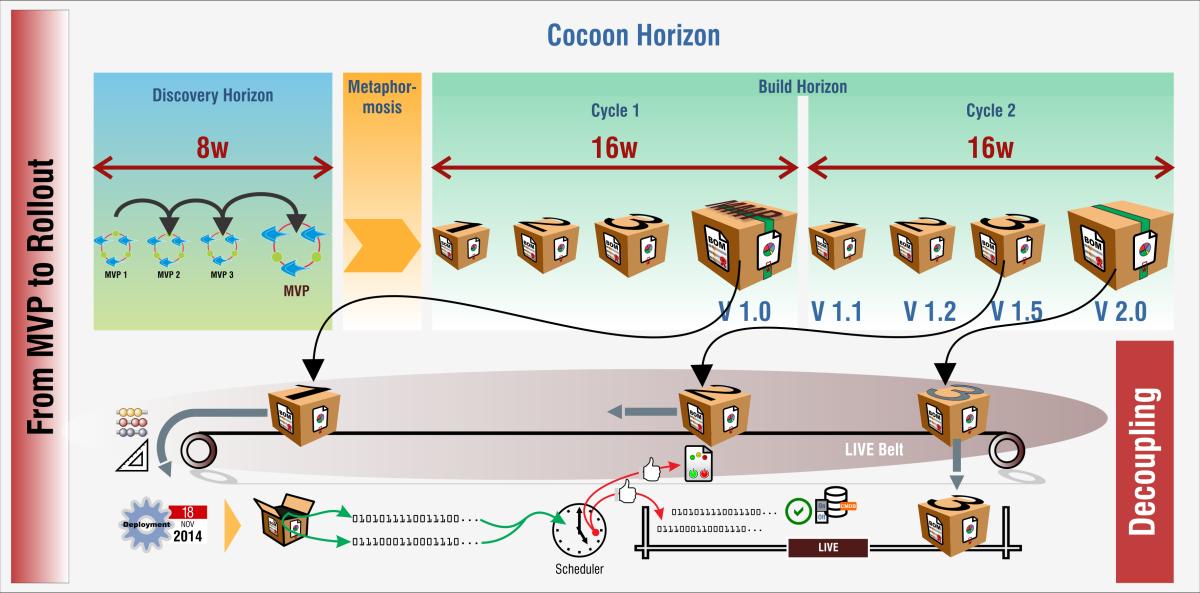… l'idéation est un processus dont on essaye de sortir le plus rapidement possible; on en limite le financement / mise de fonds à maximum 8 semaines. Dans le schéma qui précède, l'idéation est présentée comme l'horizon de découverte (Discovery Horizon). Ensuite, on se met en position de démarrer une construction standardisée / industrialisée (on quitte le mode idéation) ce qui est une période assez variable d'organisation à organisation — Metamorphosis dans le schéma du dessus. Enfin, on entame le véritable travail afin de pouvoir mettre sur le marché une version publique (MMP — ). On peut donc se baser sur une durée d'environ 21 semaines pour la période de construction (pour des initiatives d'une certaine ampleur, et avec 1 seul cycle de mise sur le marché).