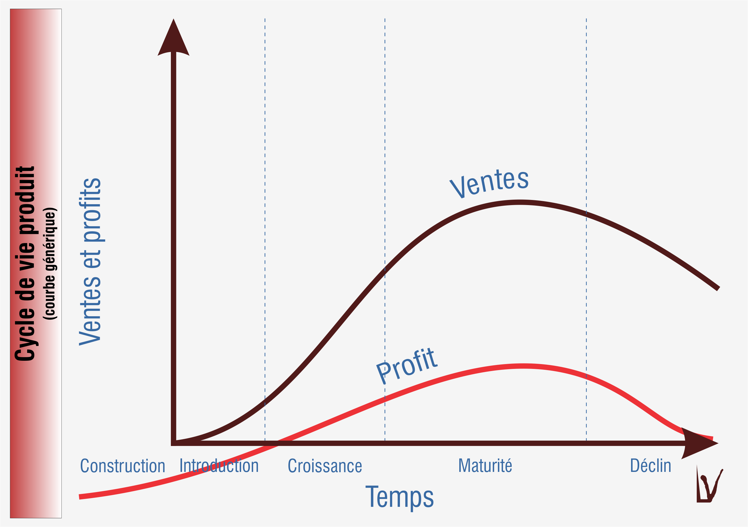 Le cycle de vie générique d'un produit ou d'un service est une courbe en cloche classique. Il comporte 4 grandes phases (Introduction / Lancement, Croissance, Maturité et Déclin) précédées de sa phase de construction / mise au point.